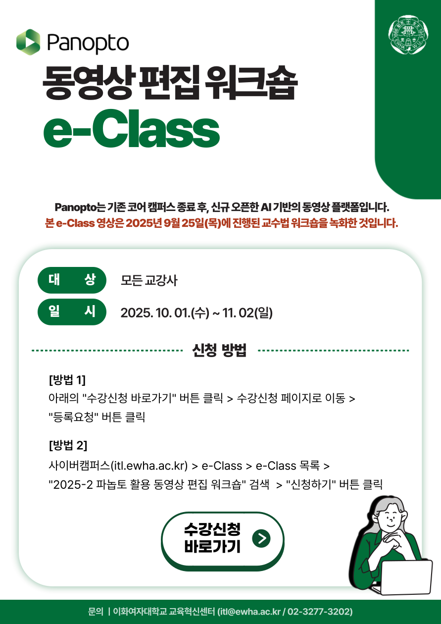 교육혁신센터에서는 효과적인 수업 운영을 위하여 파놉토 활용 동영상 편집 워크숍을 열린 e-Class를 통해 제공합니다.