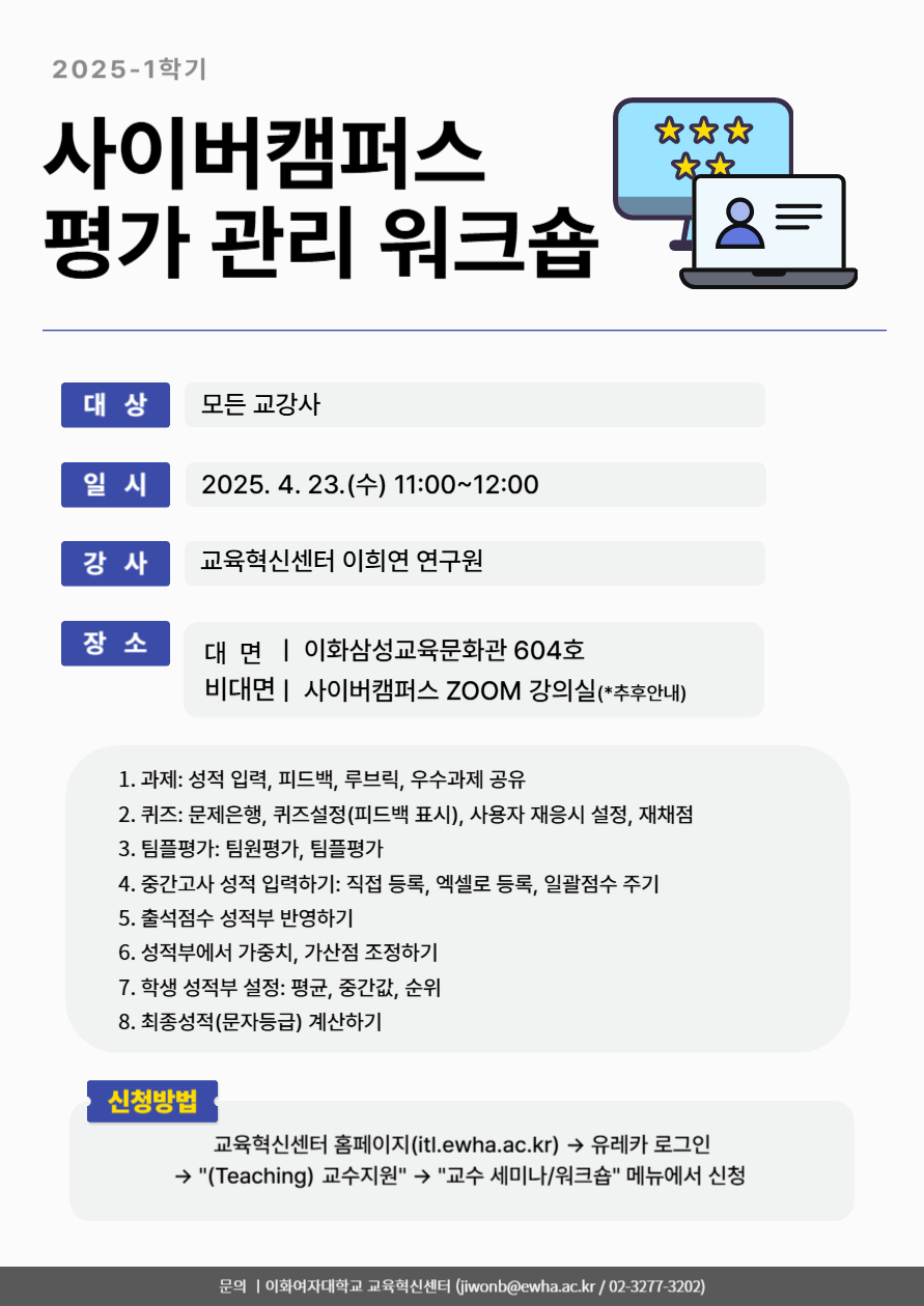 교육혁신센터에서는 효과적인 수업 운영을 위하여 <사이버캠퍼스 평가 관리 워크숍>을 진행합니다.온/오프라인 혼합형식으로 진행될 예정이오니 대면 참석을 원하시는 교수님께서는 4월 21일(월) 23:59까지 신청 바랍니다.