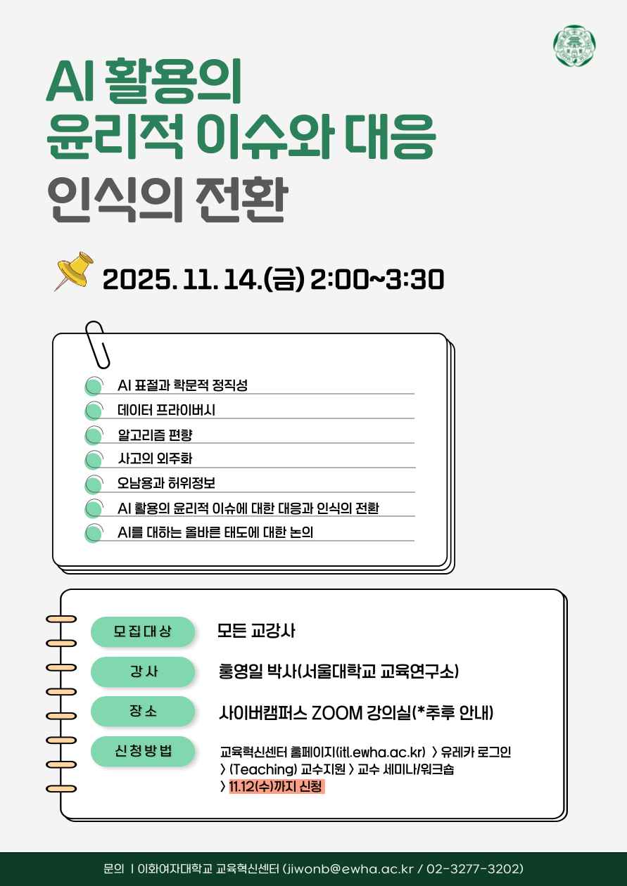 교육혁신센터에서는 강의역량 향상을 위한 <AI 활용의 윤리적 이슈와 대응: 인식의 전환> 워크숍을 비대면으로 진행합니다. 참석을 원하는 교수님께서는 11월 12일(수)까지 신청해주시기 바랍니다.